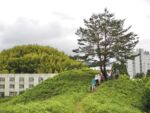 Akatsuchiyama Kofun tomb is located in Tenri’s Ichinomoto Town. To the west of the tomb is a housing community and Wanishita Jinja shrine, and to the east is the Sharp Tenri Facility, which features the Sharp Technology Innovation Museum. Below the tomb, we can see the Nara Basin, and the Meihan Expressway.