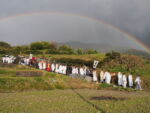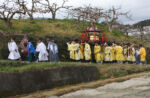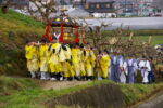 In the crisp winds of spring, they walk a pastoral village path about four kilometers round trip to Oyamato Jinja shrine’s Otabisho, a detached part of the shrine. At the Otabisho, people from each of the towns give an offering to the shrine, which may be food, sake, or a traditional dance. After enjoying a meal together, the procession walks back to Oyamato Jinja shrine.
