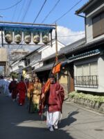 In the morning, people wearing Heian period (7794-1195 CE) clothing ride horses from Ta Town to Isonokami Jingu shrine, and bring a sacred Gohei to the shrine. The Gohei is offered to the shrine in the main ceremony in the morning.